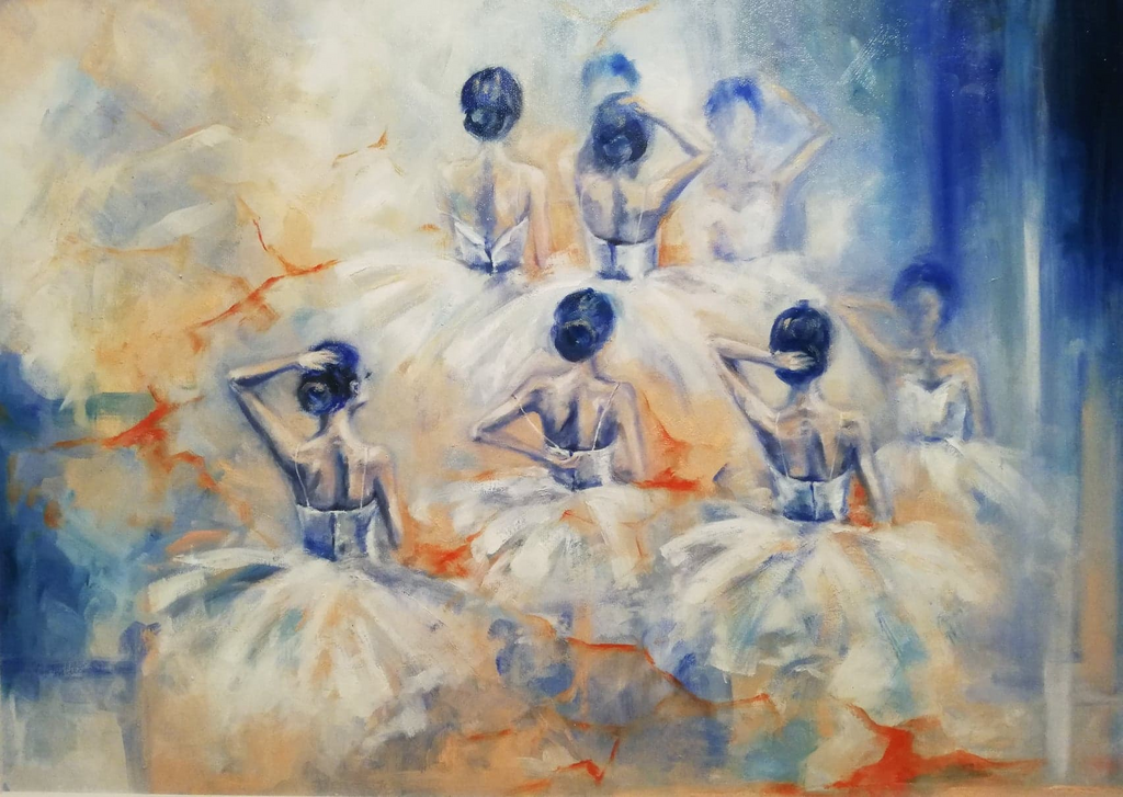 Ioana Man demonstrates her technical mastery through a colour palette dominated by ethereal shades of blue and subtle accents of orange, which amplify the dreamlike atmosphere and create a fine visual tension, in which dance transcends mere artistic performance—it becomes a mystical experience, a meditation on ephemerality and beauty. The way she combines splashes of colour and broad, almost abstract strokes creates textures that evoke the fluidity of the dancers’ movements and the delicacy of the materials. The tutus of the ballerinas, painted in shades of white and light blue, appear almost diaphanous, suggesting the weight and transparency of tulle, as well as the perpetual movement of dance. In the subtle contrasts of orange and blue, the artist creates a chromatic tension, endowing the work with a latent energy that renders the scene both tranquil and dynamic.